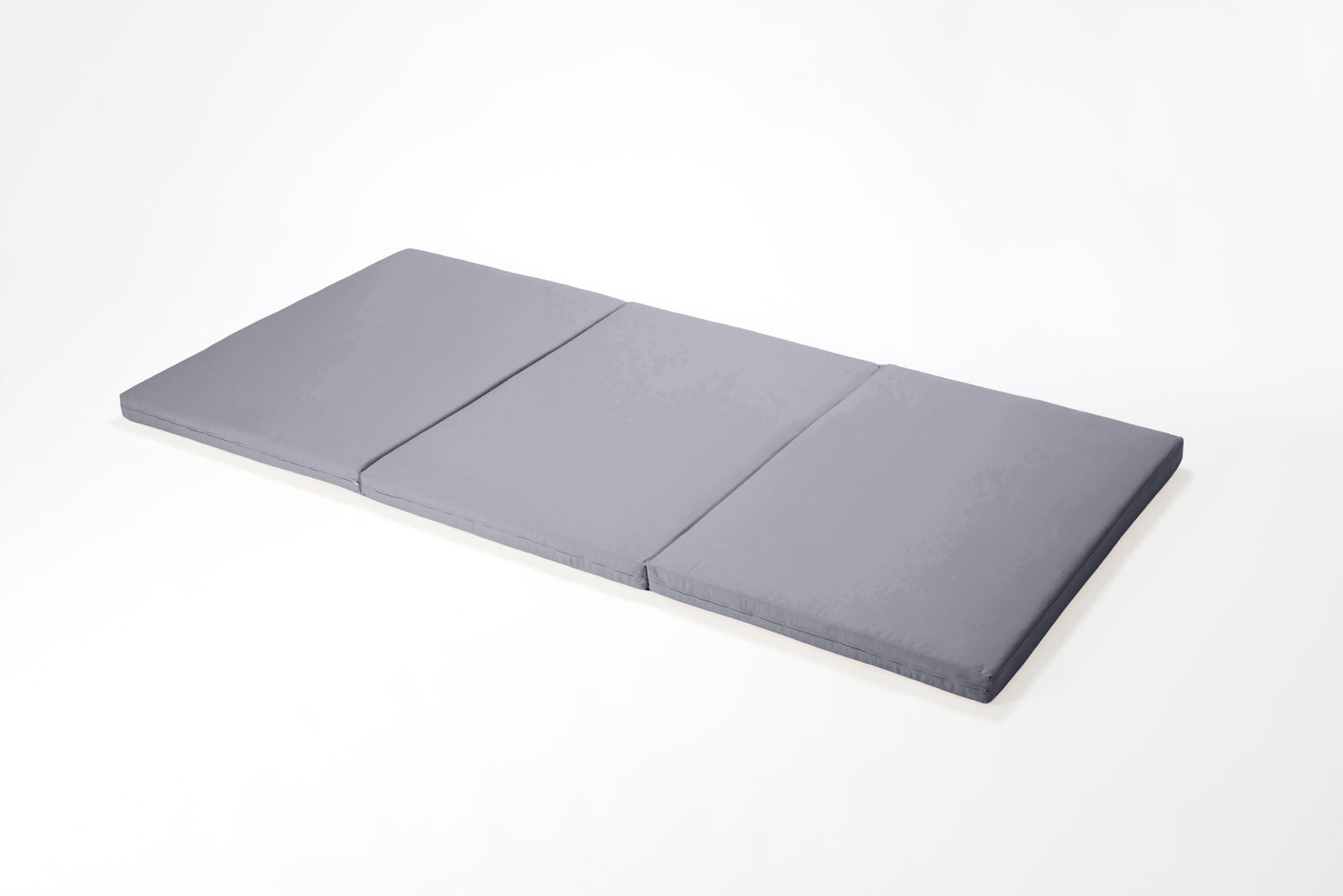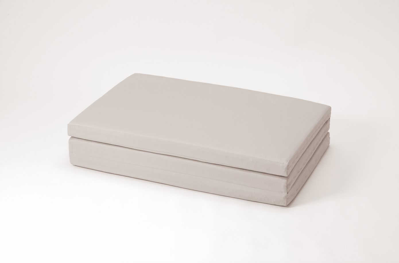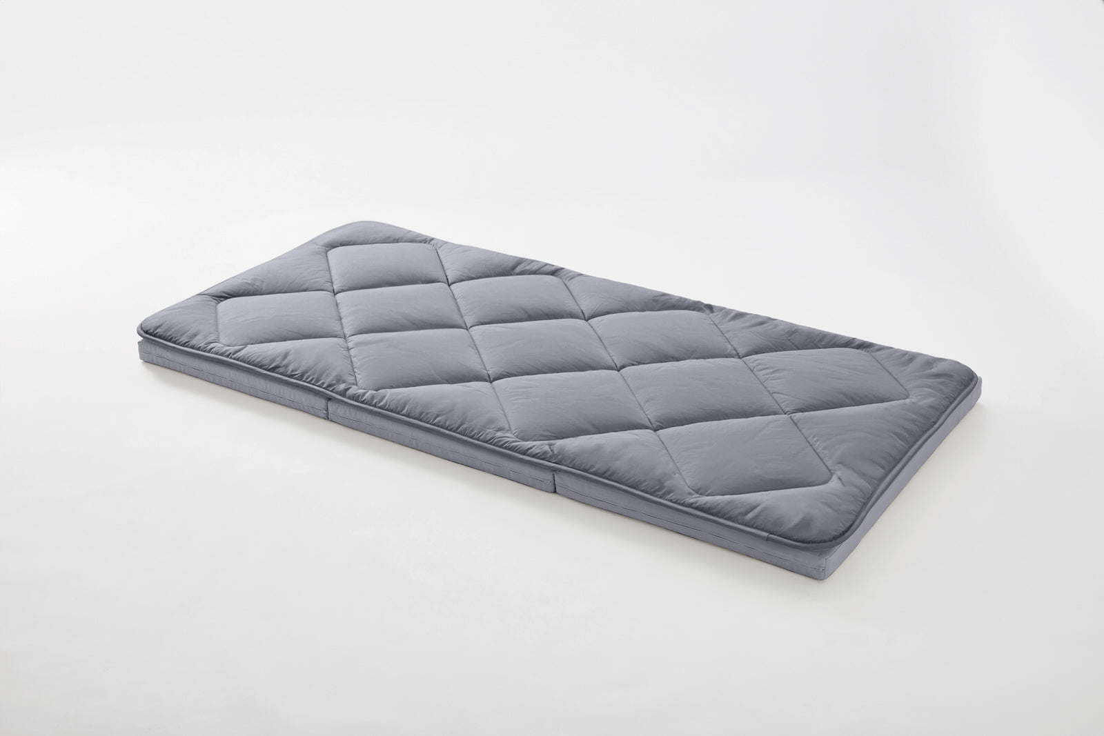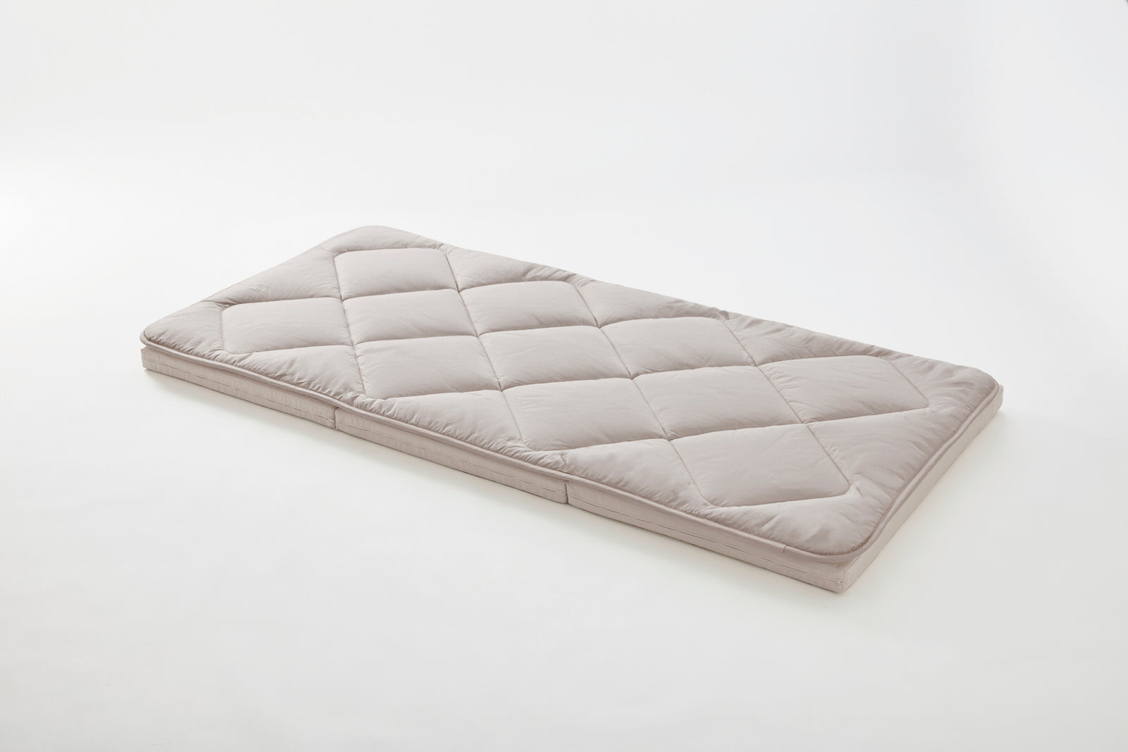 上下層にはニードルパンチ製法で作られたシート2枚を特殊製法で一体化した素材を使用。 通気性が良く、ソフトな風合いでありながら圧縮回復性が高いという特長をもたせました。 それをランダムな接合点を持つ3D クッション材の上下に積層配置 することで、体圧をバランスよく分散し、寝返りしやすい適度な硬さと吸放湿性をあわせ持った、 優れたマットレスになりました。 3つ折りタイプですので、押入れにも収納しやすく、両面でご使用ください。
